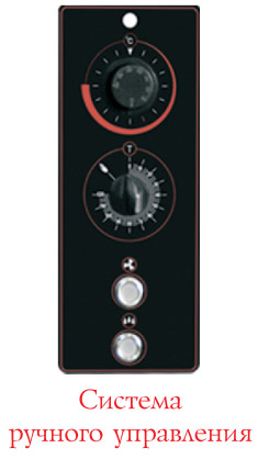 • Система ручного управления представляет из себя терморегулятор, таймер и кнопки включения нагрева и пароувлажнения