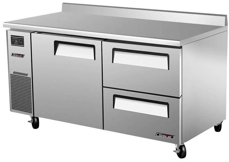 Холодильный стол Turbo air KWR15-2D-2 предназначен для раскатки теста, обработки, охлаждения и кратковременного хранения продуктов и напитков на предприятиях общественного питания и торговли. Корпус выполнен из нержавеющей стали (гальванизированная сталь на оборотной стороне и внизу) с применением пожаробезопасных стенок толщиной 60 мм, уплотнения - из АБС-пластика (акрилонитрилбутадиенстирола), не пропускающего конденсата, пол - из нержавеющей стали с алюминиевыми вставками по бокам и сзади оборудования, тройные направляющие - из высококачественной нержавеющей стали.