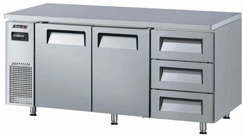 Холодильный стол Turbo air KUR18-3D-3 предназначен для раскатки теста, обработки, охлаждения и кратковременного хранения продуктов и напитков на предприятиях общественного питания и торговли. Корпус выполнен из нержавеющей стали (гальванизированная сталь на оборотной стороне и внизу) с применением пожаробезопасных стенок толщиной 60 мм, уплотнения - из АБС-пластика (акрилонитрилбутадиенстирола), не пропускающего конденсата, пол - из нержавеющей стали с алюминиевыми вставками по бокам и сзади оборудования, тройные направляющие - из высококачественной нержавеющей стали.