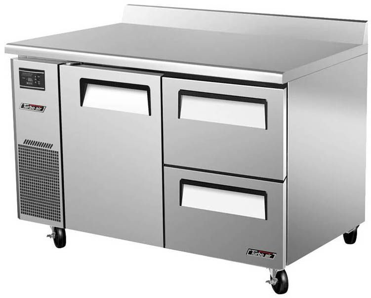 Холодильный стол Turbo air KWR12-2D-2 предназначен для раскатки теста, обработки, охлаждения и кратковременного хранения продуктов и напитков на предприятиях общественного питания и торговли. Корпус выполнен из нержавеющей стали (гальванизированная сталь на оборотной стороне и внизу) с применением пожаробезопасных стенок толщиной 60 мм, уплотнения - из АБС-пластика (акрилонитрилбутадиенстирола), не пропускающего конденсата, пол - из нержавеющей стали с алюминиевыми вставками по бокам и сзади оборудования, тройные направляющие - из высококачественной нержавеющей стали.
