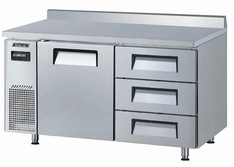 Холодильный стол Turbo air KWR15-3D-3-700 используется для охлаждения, заморозки и длительного хранения пищевых продуктов, а также для обработки ингредиентов на предприятиях общественного питания, торговли и пищевых производствах. Динамическая система охлаждения. Стол установлен на 4 колесах, оснащен дверью и 3 ящиками. Материал корпуса, ножек и направляющих - нержавеющая сталь, материал задней и нижней панелей - гальванизированная сталь, материал пола - нержавеющая сталь с алюминиевыми вставками, материал полок - толстая стальная проволока с виниловым покрытием, материал уплотнения - ABS-пластик.