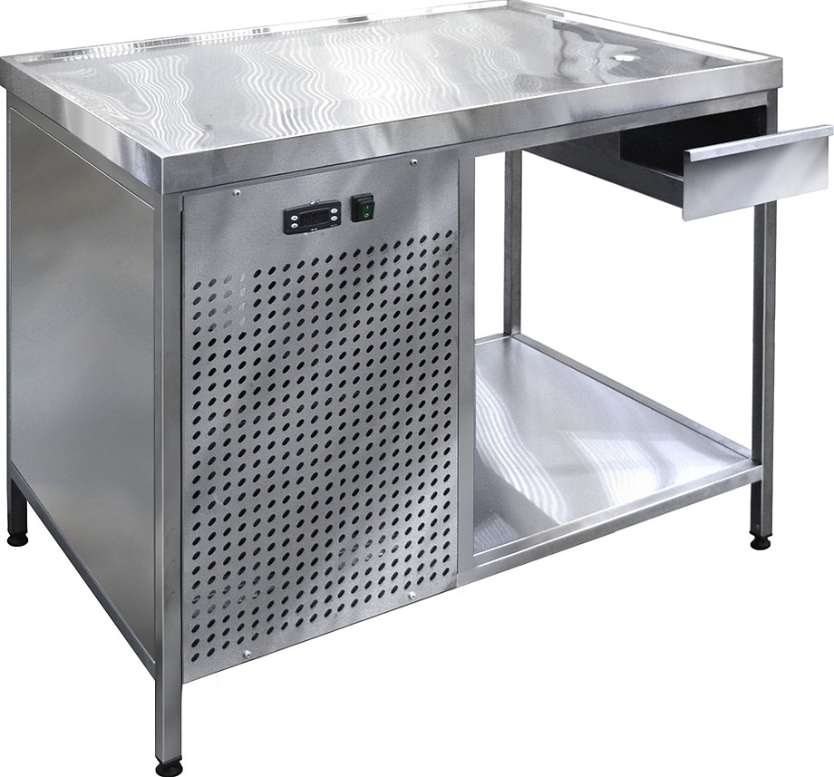 Холодильный стол Finist СХСо-1400-700 используется на предприятиях общественного питания, торговли и пищевых производствах для хранения и обработки полуфабрикатов из мяса и рыбы, заготовок для салата, охлажденных напитков и прочих пищевых продуктов. Управление при помощи кнопочной панели управления, оснащенной цифровым дисплеем. Охлаждаемая рабочая поверхность, выдвижной ящик-лоток, открытая полка для хранения продукции и инвентаря. Холодильный агрегат располагается сбоку. Стол установлен на ножки с подпятниками. Материал корпуса - нержавеющая сталь.