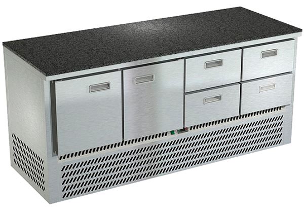 Холодильный стол Техно-ТТ СПБ/О-323/04-2206 предназначается для раскатки теста, обработки, охлаждения и кратковременного хранения продуктов и напитков на предприятиях общественного питания, торговли и пищевых производствах. Секции оснащены направляющими и ящиками с доводчиками. Материал корпуса - нержавеющая сталь AISI 430, материал столешницы - гранит (толщина 20 мм), материал задней панели и дна - оцинкованная сталь.