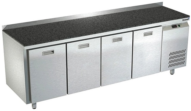 Холодильный стол Техно-ТТ СПБ/О-423/04-2207 предназначается для раскатки теста, обработки, охлаждения и кратковременного хранения продуктов и напитков на предприятиях общественного питания, торговли и пищевых производствах. Секции оснащены направляющими и ящиками с доводчиками. Материал корпуса - нержавеющая сталь AISI 430, материал столешницы - гранит (толщина 20 мм), материал задней панели и дна - оцинкованная сталь.