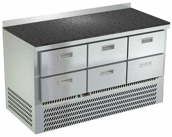 Холодильный стол Техно-ТТ СПН/О-423/06-1407 предназначается для раскатки теста, обработки, охлаждения и кратковременного хранения продуктов и напитков на предприятиях общественного питания, торговли и пищевых производствах. Секции оснащены направляющими и ящиками с доводчиками. Материал корпуса - нержавеющая сталь AISI 430, материал столешницы - гранит (толщина 20 мм), материал задней панели и дна - оцинкованная сталь.