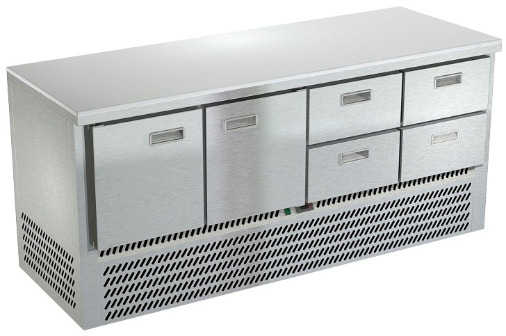 Холодильный стол Техно-ТТ СПН/О-522/24-1906 предназначается для раскатки теста, обработки, охлаждения и кратковременного хранения продуктов и напитков на предприятиях общественного питания, торговли и пищевых производствах. Секции оснащены направляющими и ящиками с доводчиками. Материал корпуса - нержавеющая сталь AISI 430, материал столешницы - полипропилен (толщина 20 мм), материал задней панели и дна - оцинкованная сталь.