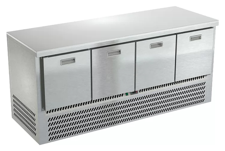 Холодильный стол Техно-ТТ СПН/О-523/04-1907 предназначается для раскатки теста, обработки, охлаждения и кратковременного хранения продуктов и напитков на предприятиях общественного питания, торговли и пищевых производствах. Секции оснащены направляющими и ящиками с доводчиками. Материал корпуса - нержавеющая сталь AISI 430, материал столешницы - полипропилен (толщина 20 мм), материал задней панели и дна - оцинкованная сталь.