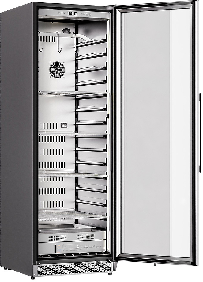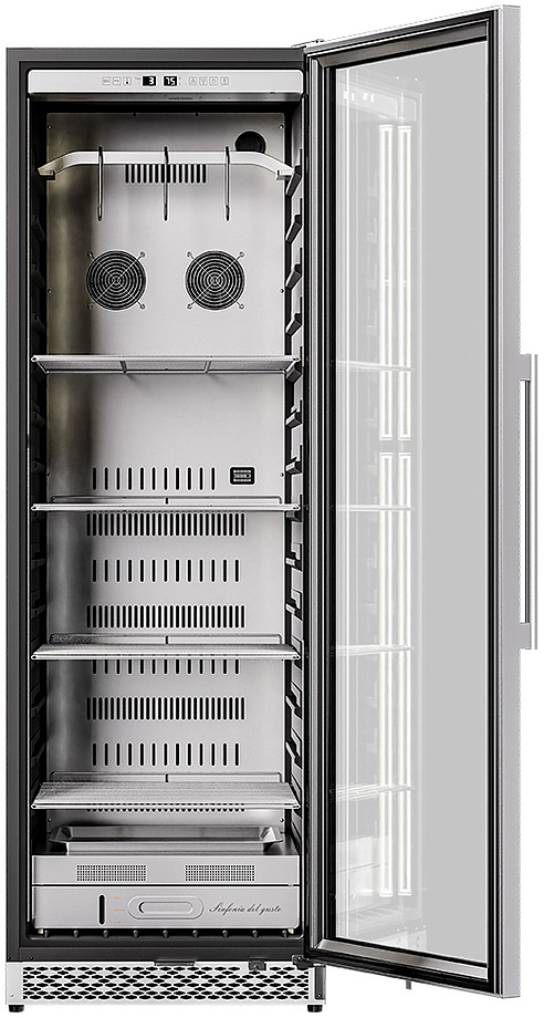 Шкаф Meyvel MM-135SR используется для охлаждения, хранения и вызревания мяса, птицы, колбасы, рыбы, ветчины, сыра и салями на предприятиях общественного питания, торговли, пищевых производствах и в домашних условиях. Модель оснащена сенсорным управлением, угольным фильтром, подсветкой, демонстрационным освещением, выдвижными полками, удобной ручкой, замком, поддоном для гималайской соли и регулируемыми по высоте ножками. Материал корпуса и ручки - сталь, материал рамки двери - бесшовная нержавеющая сталь, материал двери - тройное стекло с УФ фильтром, материал полок-решеток - хромированный металл.