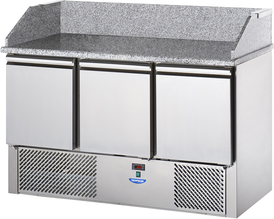 Стол для пиццы Tecnodom SLV03PZ используется на предприятиях общественного питания, торговли и пищевых производствах для раскатки теста и обработки ингредиентов перед приготовлением пиццы, а также для охлаждения и кратковременного хранения различных блюд, напитков и продуктов. Данная модель оснащена электронным управлением, NTC датчиком, динамическим охлаждением, автоматической оттайкой, испарителем с антикоррозионной обработкой и самозакрывающимися дверьми с магнитным уплотнителем. Материал корпуса - высококачественная нержавеющая сталь, материал рабочей поверхности - гранит, материал теплоизоляции - полиуретан.