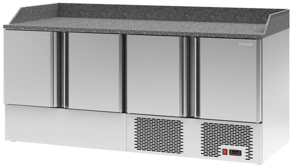 Холодильный стол для пиццы POLAIR TMi4pizza-G серии Grande используется на предприятиях общественного питания, торговли и пищевых производствах для раскатки теста, хранения и обработки ингредиентов перед приготовлением пиццы. Модель оснащена автоматической оттайкой, электронным терморегулятором и регулируемыми ножками. Материал внешнего и внутреннего корпуса и дверей - высококачественная нержавеющая сталь, материал столешницы и борта - натуральный гранит, материал теплоизоляции - пенополиуретан, материал полок - окрашенная проволока.
