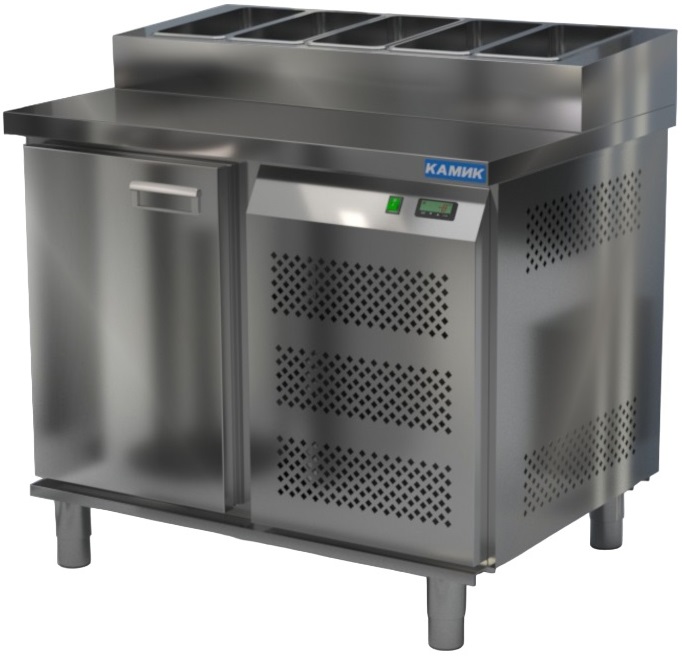 Холодильный стол КАМИК СОП-101076 используется на предприятиях общественного питания и торговли для охлаждения и хранения продуктов, напитков и готовых блюд, а также для раскатки теста и обработки ингредиентов для приготовления пиццы. Конструкция разделена на секции, каждая из которых оборудована сетчатой полкой и парой направляющих. Корпус выполнен из нержавеющей стали AISI 430 толщиной 1 мм, столешница - из нержавеющей стали AISI 304 толщиной 1 мм.
