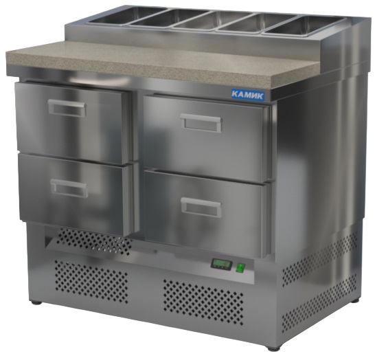 Холодильный стол КАМИК СОП-041076КН используется на предприятиях общественного питания и торговли для охлаждения и хранения продуктов, напитков и готовых блюд, а также для раскатки теста и обработки ингредиентов для приготовления пиццы. Конструкция разделена на секции, каждая из которых оборудована сетчатой полкой и парой направляющих. Корпус выполнен из нержавеющей стали AISI 430 толщиной 1 мм, столешница - из нержавеющей стали AISI 304 толщиной 1 мм.