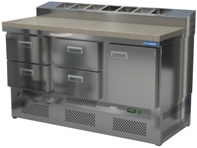 Холодильный стол КАМИК СОП-141573КН используется на предприятиях общественного питания и торговли для охлаждения и хранения продуктов, напитков и готовых блюд, а также для раскатки теста и обработки ингредиентов для приготовления пиццы. Конструкция разделена на секции, каждая из которых оборудована сетчатой полкой и парой направляющих. Корпус выполнен из нержавеющей стали AISI 430 толщиной 1 мм, столешница - из нержавеющей стали AISI 304 толщиной 1 мм.