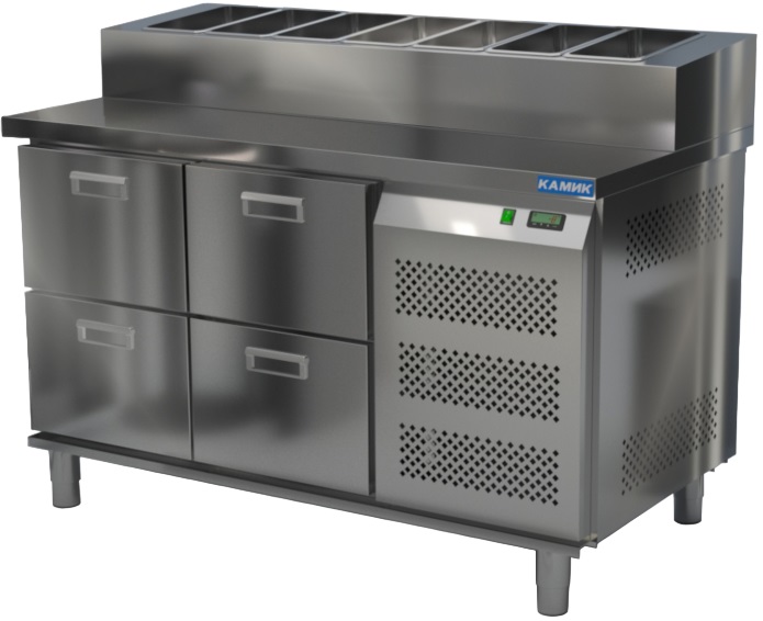 Холодильный стол КАМИК СОП-041473 используется на предприятиях общественного питания и торговли для охлаждения и хранения продуктов, напитков и готовых блюд, а также для раскатки теста и обработки ингредиентов для приготовления пиццы. Конструкция разделена на секции, каждая из которых оборудована сетчатой полкой и парой направляющих. Корпус выполнен из нержавеющей стали AISI 430 толщиной 1 мм, столешница - из нержавеющей стали AISI 304 толщиной 1 мм.