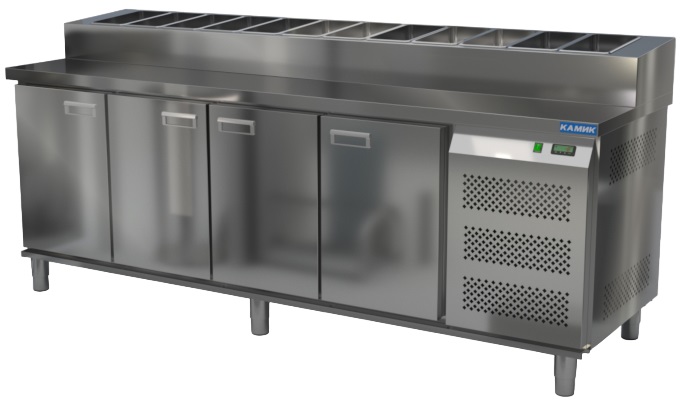 Холодильный стол КАМИК СОП-402373 используется на предприятиях общественного питания и торговли для охлаждения и хранения продуктов, напитков и готовых блюд, а также для раскатки теста и обработки ингредиентов для приготовления пиццы. Конструкция разделена на секции, каждая из которых оборудована сетчатой полкой и парой направляющих. Корпус выполнен из нержавеющей стали AISI 430 толщиной 1 мм, столешница - из нержавеющей стали AISI 304 толщиной 1 мм.
