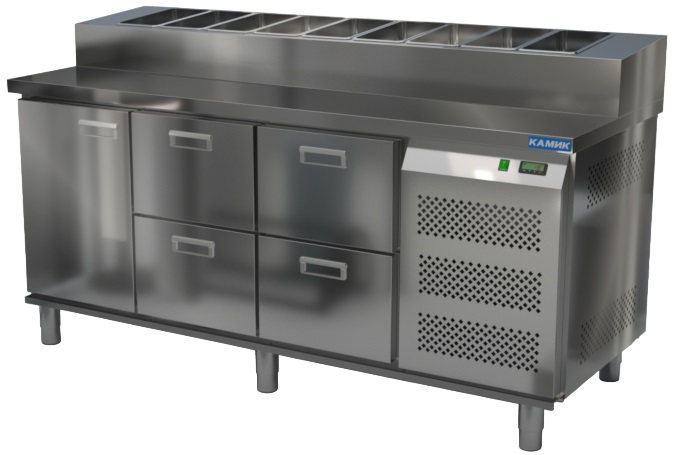 Холодильный стол КАМИК СОП-1418576 используется на предприятиях общественного питания и торговли для охлаждения и хранения продуктов, напитков и готовых блюд, а также для раскатки теста и обработки ингредиентов для приготовления пиццы. Конструкция разделена на секции, каждая из которых оборудована сетчатой полкой и парой направляющих. Корпус выполнен из нержавеющей стали AISI 430 толщиной 1 мм, столешница - из нержавеющей стали AISI 304 толщиной 1 мм.