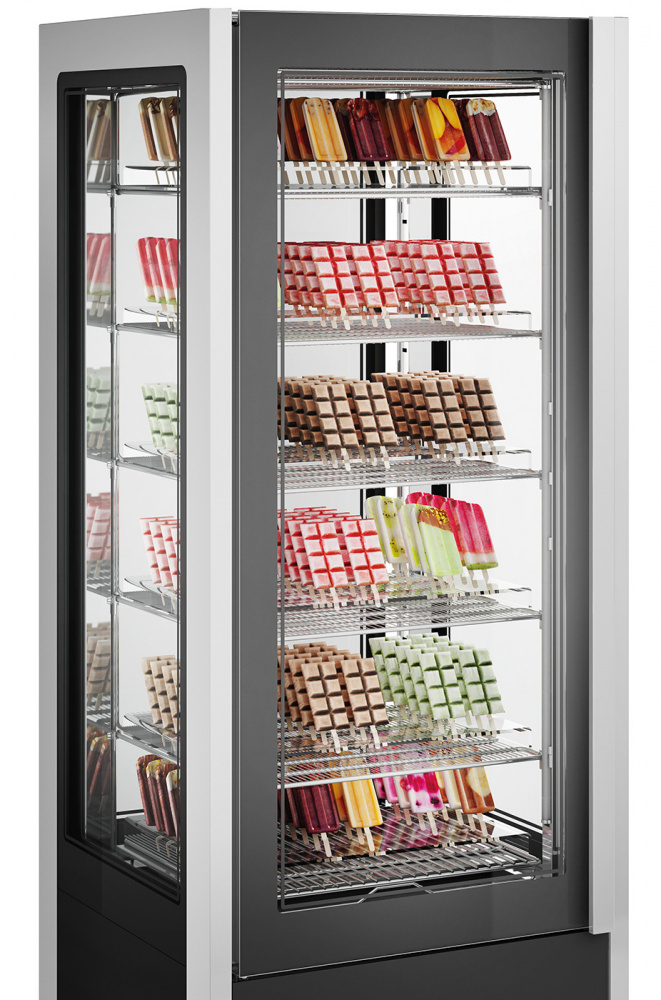 Кондитерский шкаф ISA Cristal Tower 75 H206 RV TB/TN используется на предприятиях общественного питания и торговых точках для демонстрации, охлаждения и краткосрочного хранения кондитерских изделий и десертов, а также для глубокой заморозки продуктов. Материал корпуса - окрашенный металл, изоляция выполнена из пенополиуретана, вспененного углекислотой (без использования озоноразрушающих веществ). Электронная панель управления с системой Touch Pad. Максимальная температура окружающей среды - 30°. Шкаф остеклён с четырех сторон закалённым двойным стеклом и имеет встроенное внутреннее LED освещение.