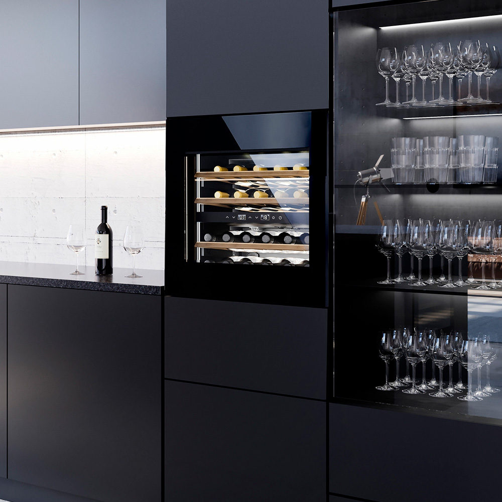 • Полки на шарикоподшипниковых направляющих с фронтальными бортиками для плавного выдвижения и предотвращения выпадения бутылок