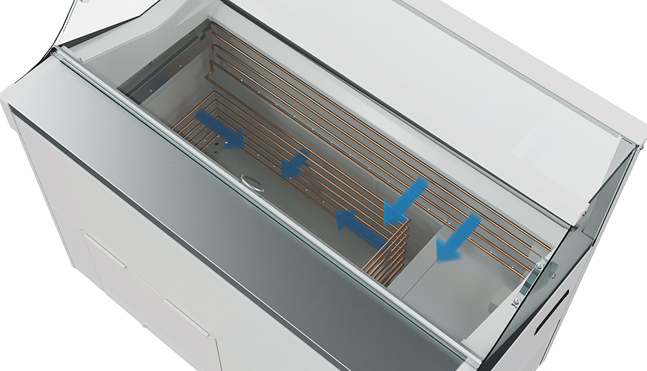 Витрина для мороженого Carboma IC72 SL 1,3-1 9003 предназначается для предпродажной демонстрации, охлаждения и хранения мороженого. Модель оснащена системой автоматической разморозки, технологией одноконтурной морозильной цепи из 2 элементов и технологией нагрева фронтального стеклопакета, позволяющей избегать запотевание стекла. Встроенные ручки, поворотно-откидная створка и колесики для перемещения. Материал столешницы - нержавеющая сталь, материал передней панели - крашеная сталь, створка из плексигласа, теплоизоляция корпуса - пенополиуретан.