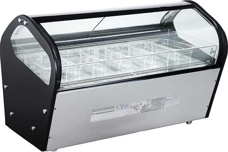 Витрина для мороженого Koreco RTD122L используется на предприятиях общественного питания и торговли для демонстрации и хранения мороженого, сорбета и йогурт-мороженого. Корпус имеет трапециевидное сечение, зауженное к низу.