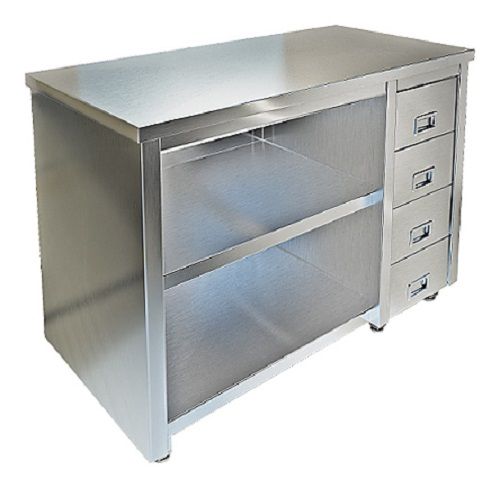 Производственный стол Техно-ТТ СПС-127/1207Н-П предназначен для разделки и обработки пищевых продуктов, а также для расстановки и хранения посуды и кухонного инвентаря на предприятиях общественного питания и торговли. Модель оснащена 4 выдвижными ящиками, расположенными справа, 1 полкой и регулируемыми по высоте ножками, что позволяет компенсировать неровности пола. Сварной корпус выполнен из нержавеющей стали AISI 304, столешница - из нержавеющей стали AISI 304 и ЛДСП, задняя стенка - из нержавеющей стали AISI 430.