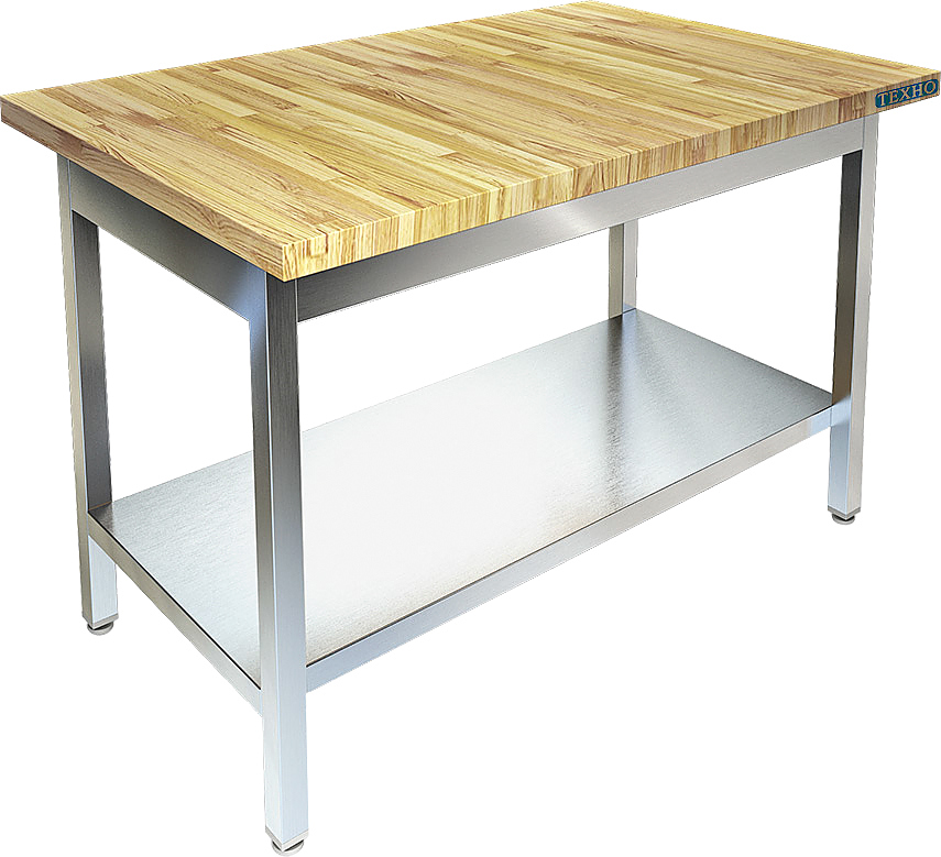 Кондитерский стол Техно-ТТ СП-323/1708 предназначен для раскатки теста и обработки ингредиентов для приготовления кондитерских и хлебобулочных изделий, а также для расстановки и хранения посуды и кухонного инвентаря на предприятиях общественного питания, торговли и пищевых производствах. Модель оснащена регулируемыми по высоте ножками, что позволяет компенсировать неровности пола. Материал разборного каркаса - труба (40x40 мм) из нержавеющей стали AISI 304, материал сплошной полки - нержавеющая сталь AISI 430, материал столешницы - бук.