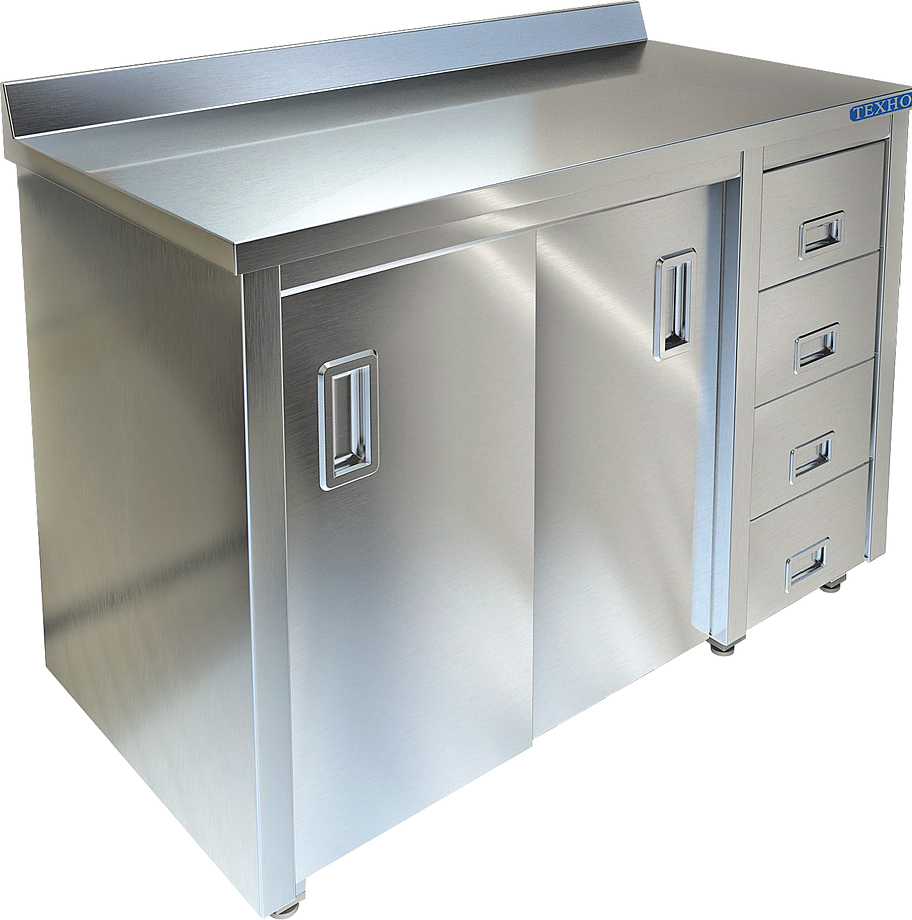 Производственный стол-тумба Техно-ТТ СПС-226/1300Н-Л предназначен для разделки и обработки пищевых продуктов, а также для расстановки и хранения посуды и кухонного инвентаря на предприятиях общественного питания, торговли и пищевых производствах. Стол оснащен бортом, 2 дверьми-купе и 4 выдвижными ящиками. Материал корпуса, полки и задней стенки - нержавеющая сталь AISI 430, материал столешницы - нержавеющая сталь AISI 304.