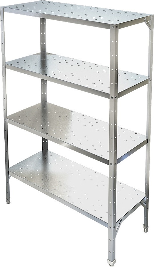 Кухонный стеллаж Техно-ТТ СТР-524/1306 используется на предприятиях общественного питания, торговли и пищевых производствах для хранения посуды, кухонного инвентаря и продуктов. В модели предусмотрены регулируемые ножки и полки. Тип каркаса - разборный, полки - перфорированные. Материал каркаса - нержавеющая сталь AISI 430 (уголок 40х40 мм толщиной 2 мм), материал полок - нержавеющая сталь AISI 430 (толщина 0.8 мм).
