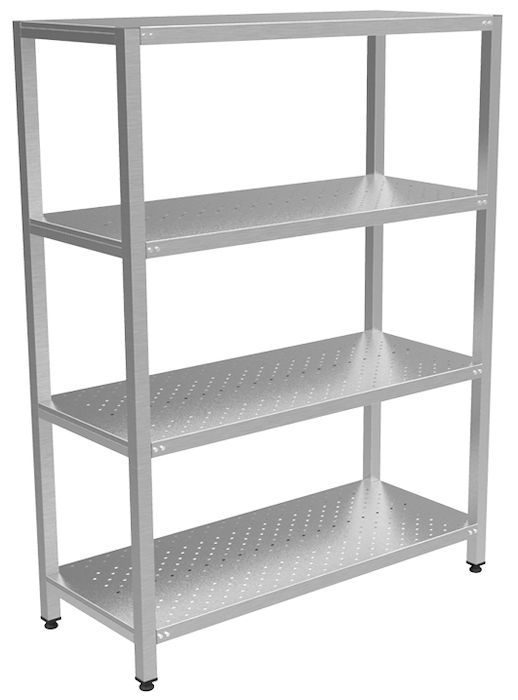 Кухонный стеллаж Кобор СКТПР-150/60 предназначается для хранения посуды, кухонного инвентаря и сухих продуктов на предприятиях общественного питания, торговли и пищевых производствах. Перфорированные полки регулируются по высоте с шагом 100 мм. Тип каркаса - разборный. Ножки регулируются по высоте и не подвергаются коррозии. Материал каркаса - нержавеющая труба (40x40 мм), материал полок - нержавеющая сталь AISI 430.