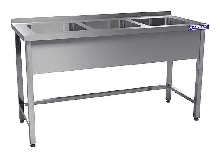 Моечная ванна КАМИК ВМ-3-42177 используется на предприятиях общественного питания и торговли для мойки посуды, овощей и фруктов. Сварной каркас выполнен из нержавеющей стали AISI 430 толщиной 1 мм, столешница и цельнотянутая емкость - из нержавеющей стали AISI 304 толщиной 1,5 мм.