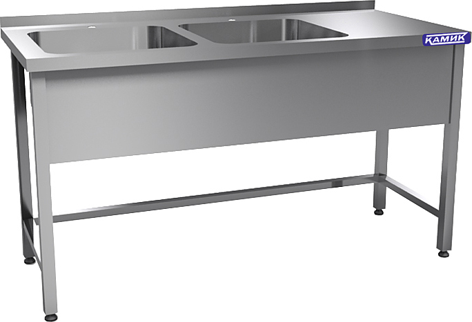 Моечная ванна КАМИК ВМ-2-42157 используется на предприятиях общественного питания и торговли для мойки посуды, овощей и фруктов. Сварной каркас выполнен из нержавеющей стали AISI 430 толщиной 1 мм, столешница и цельнотянутая емкость - из нержавеющей стали AISI 304 толщиной 1,5 мм.