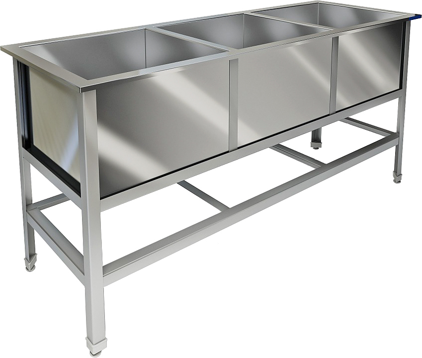 Моечная ванна Техно-ТТ ВМ-41/557 используется на предприятиях общественного питания, торговли и пищевых производствах для мытья и ополаскивания продуктов, посуды и различного инвентаря. Модель с закругленными краями оснащена регулируемыми по высоте ножками, что позволяет компенсировать неровности пола. Ванна оснащена выпуском с нержавеющей решеткой, механическим запорным клапаном и регулируемыми опорами. Материал сварного каркаса - уголок 40x40 мм из нержавеющей стали, материал емкостей - нержавеющая сталь AISI 304.