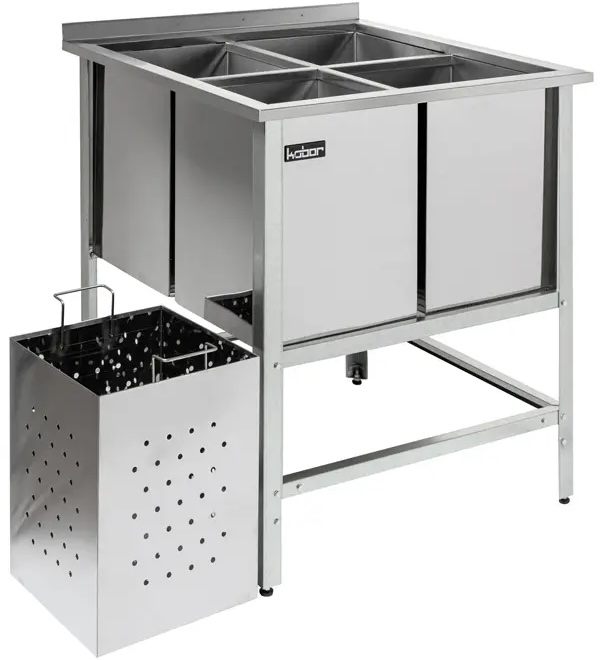 Моечная ванна Кобор ВМЯ/1-80/80/430 предназначена для санитарной обработки яиц на предприятиях общественного питания и торговли. Сварной каркас выполнен из нержавеющего стального уголка, раковины - из нержавеющей стали AISI 430.