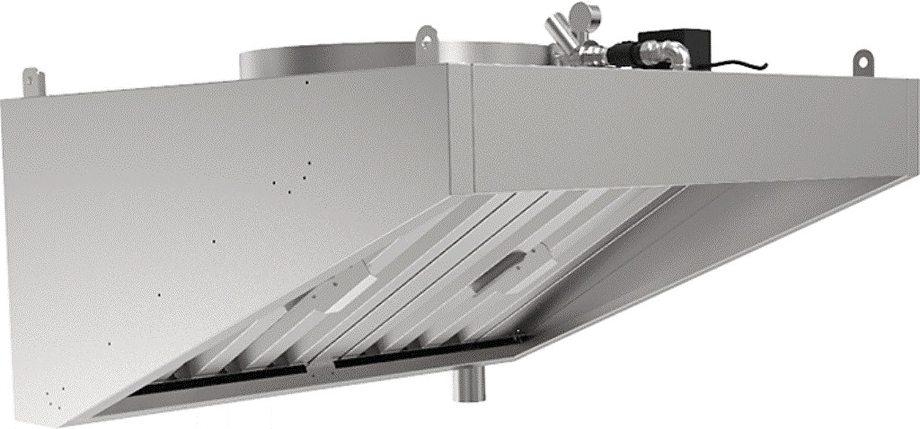 Вытяжной зонт с гидрозатвором Кобор HFR-2-140/100/К используется на предприятиях общественного питания и пищевых производствах с использованием открытого огня. Воздушные массы проходят фильтрацию от жира и сажи и попадают в водяную завесу, охлаждающую и удаляющую остатки продуктов горения. Очищенный воздух поступает в вентиляционную систему, использованная жидкость и примеси удаляются в канализационный сток. Зонт оснащен системой подачи и распыления жидкости. Материал каркаса - нержавеющая сталь AISI 430.