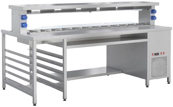 Станция RoboLabs СФО-240 используется на предприятиях общественного питания, торговли и пищевых для производствах с целью комплексного оснащения места для приготовления и продажи бургеров. Модель оснащена охлаждаемой ванной на 12 гастроемкостей, рабочей зоной, тепловой полкой, полкой и направляющими. Материал станции - высококачественная нержавеющая сталь.
