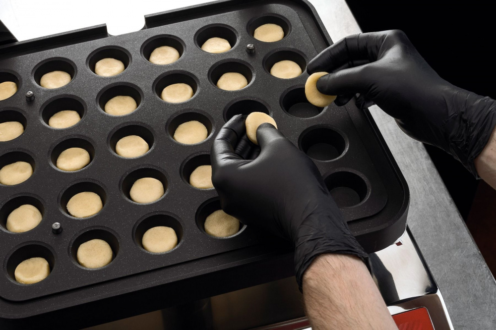 Тарталетница Pavoni NEWCOOKMATIC используется в пекарнях и кондитерских, на предприятиях пищевой промышленности и общественного питания для формовки и выпечки основ (тарталеток) из песочного и слоеного теста различной формы и размера. Модель оснащена электронным таймером со звуковым сигналом окончания цикла выпечки.