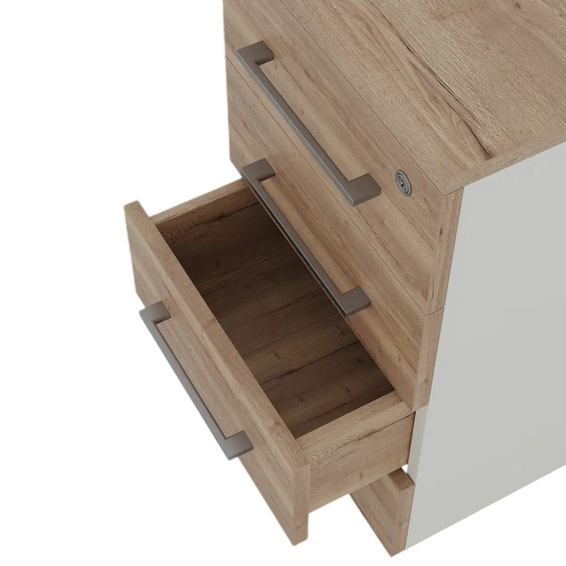 Приставная тумба Кобор TS4-40/60 white/natural предназначена для хранения документов, канцелярских принадлежностей и других мелочей в офисных и коммерческих помещениях, а также в учебных заведениях. Тумба станет удобным дополнением рабочего пространства, и её можно разместить как под столом, так и рядом с ним, адаптируя пространство под свои задачи. Модель оснащена 4 выдвижными ящиками и 4 регулируемыми по высоте опорами. Материал корпуса - прочный ЛДСП толщиной 16 мм, материал столешницы и ящиков - прочный ЛДСП толщиной 25 мм, материал задней стенки - окрашенный металл.