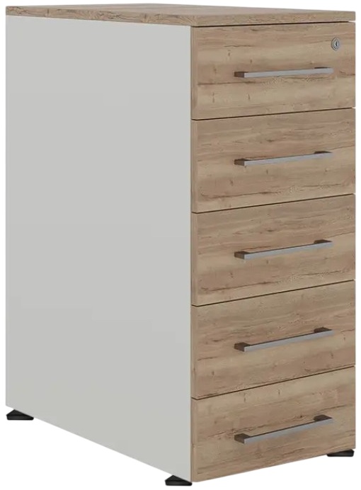 Приставная тумба Кобор TS5-40/60 white/natural предназначена для хранения документов, канцелярских принадлежностей и других мелочей в офисных и коммерческих помещениях, а также в учебных заведениях. Тумба станет удобным дополнением рабочего пространства, и её можно разместить как под столом, так и рядом с ним, адаптируя пространство под свои задачи. Модель оснащена 5 выдвижными ящиками и 4 регулируемыми по высоте опорами. Материал корпуса - прочный ЛДСП толщиной 16 мм, материал столешницы и ящиков - прочный ЛДСП толщиной 25 мм, материал задней стенки - окрашенный металл.