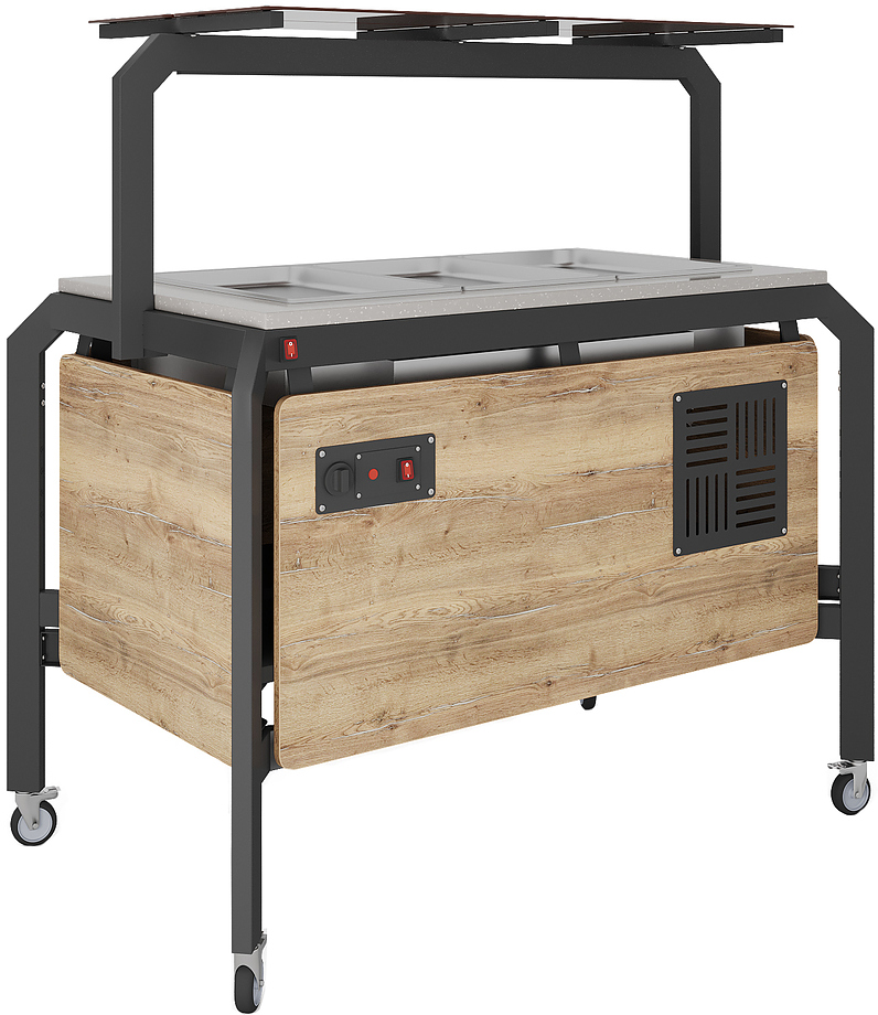 Мармит Кобор AN120 используется для демонстрационной подачи, кратковременного хранения и поддержания в горячем состоянии гарниров в составе линий раздачи на предприятиях общественного питания, торговли и пищевых производствах. Модель оснащена механическим терморегулятором, открытой полкой, полкой надстройкой со стеклом, и колесами, 2 из которых с тормозами. Материал сварного каркаса - окрашенная сталь (профиль с сечением 60х30 мм), материал внешнего корпуса и столешницы - ЛДСП.