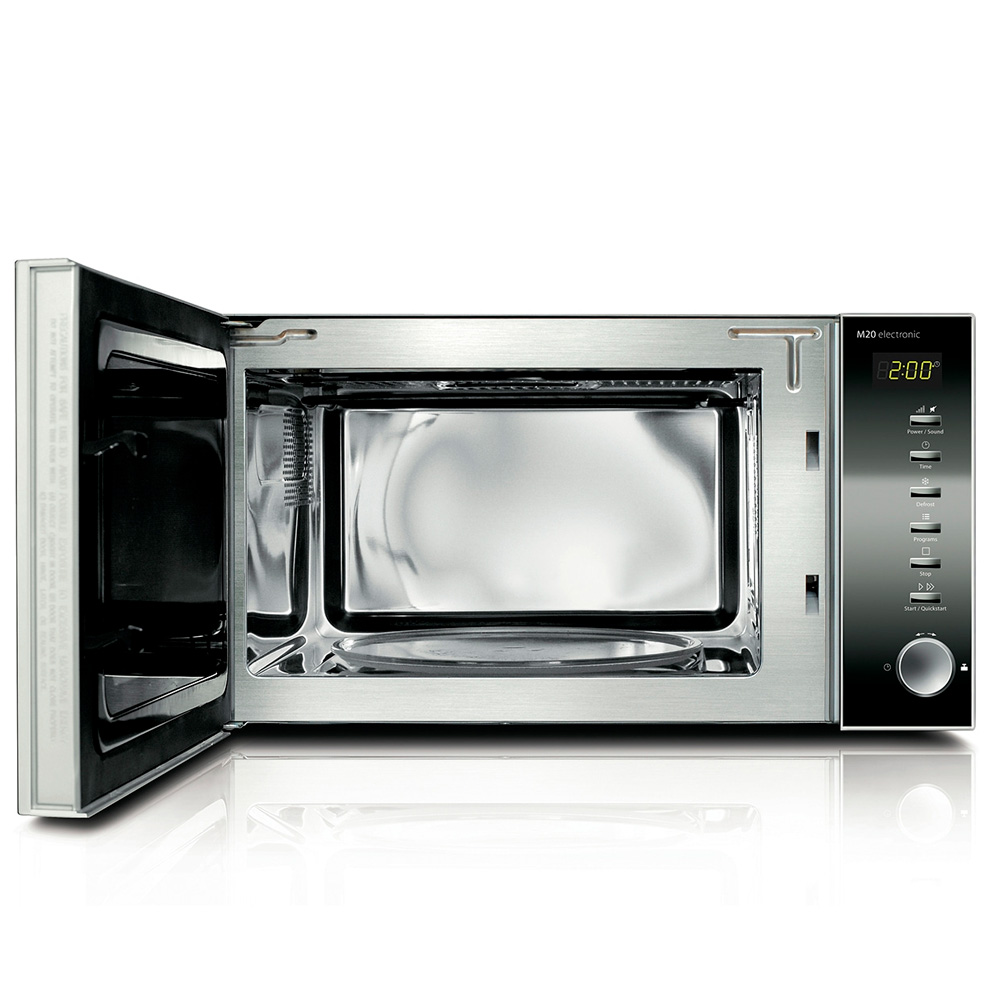 Микроволновая печь CASO M 20 Electronic Black используется для приготовления блюд, разогрева и разморозки продуктов и полуфабрикатов на предприятиях общественного питания, торговли, пищевых производствах и в домашних условиях. Модель оснащена электромеханическим управлением, таймером с сигналом окончания, часами, подсветкой камеры, поворотной тарелкой и вертикальной ручкой. Материал корпуса и внутренней обшивки - высококачественная нержавеющая сталь, материал тарелки - стекло.